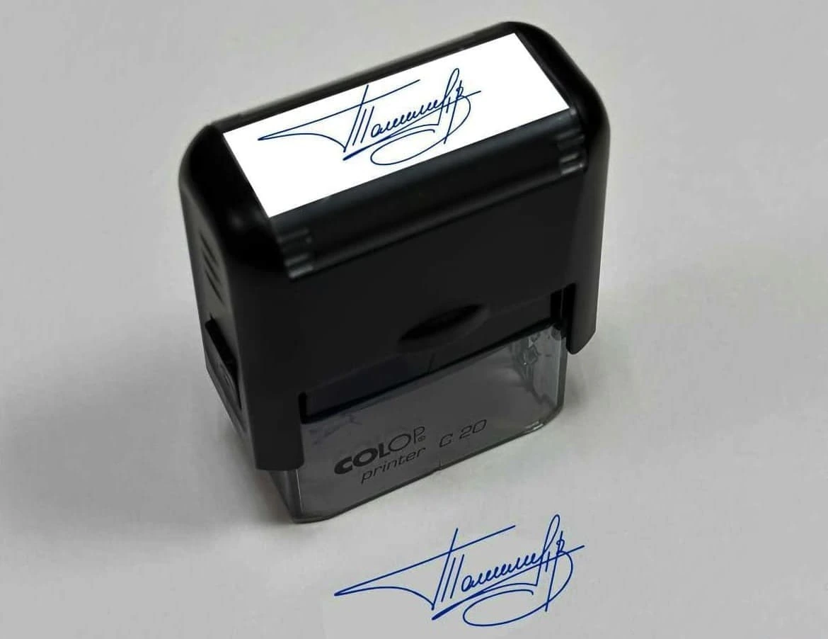 Мы уточним нюансы, такие как размер, форму, цвет, оснастку, чтобы подобрать подходящий штамп. После этого переходим к подготовке макета: первым шагом заказчик несколько раз воспроизводит личную подпись, для этого может использоваться программное обеспечение или ручка с листком бумаги. Так как штамп должен повторять мельчайшие детали, подпись после сканирования дополнительно обрабатывается для улучшения четкости. На этом этапе у клиента есть возможность внести все желаемые правки и изменения. Далее мы подбираем материалы и переходим к изготовлению, на оборудовании получается факсимиле на основании полученного изображения.